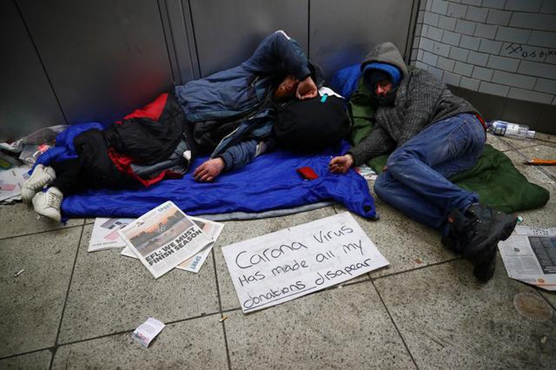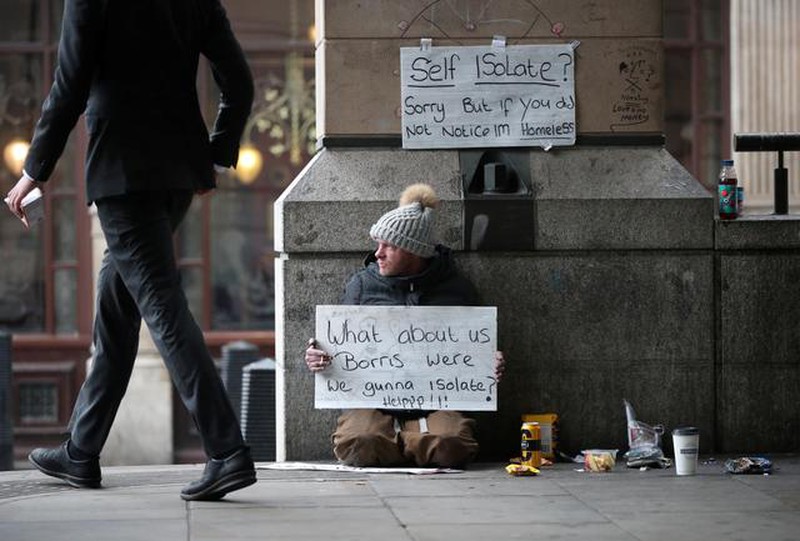 Những người vô gia cư ở ga tàu điện ngầm Westminster tại London, Anh kêu gọi sự giúp đỡ trước sự hoành hành của dịch Covid-19. |