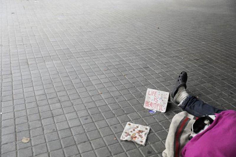 Một người vô gia cư tên Alessandro đến từ Italy, cùng chú chó Otto, ngồi trước cửa một siêu thị ở Barcelona, Tây Ban Nha, cầu xin sự giúp đỡ. |