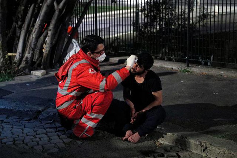Một nhân viên Chữ thập đỏ đang giúp đỡ người vô gia cư bị thương trên đường phố Rome, Italy. |
