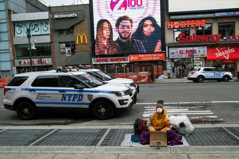 Người vô gia cư ngồi trên đường phố New York, Mỹ với tấm biển kêu gọi sự giúp đỡ. |