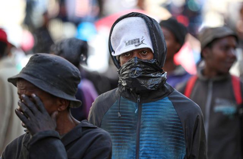 Một người vô gia cư dùng túi ni long làm khẩu trang khi được chuyển tới nơi ở tập trung tại Johannesburg, Nam Phi. |