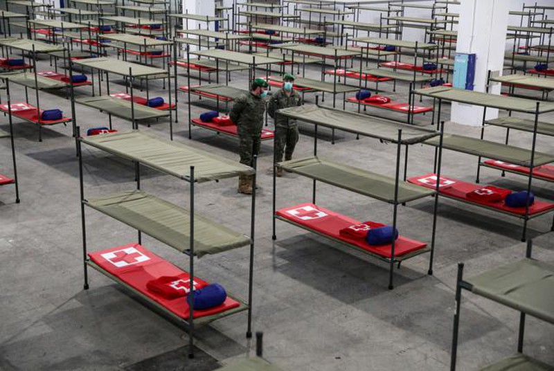 Các thành viên của Binh đoàn hậu cần, quân đội Tây Ban Nha kiểm tra những chiếc giường dã chiến được thiết lập dành cho những người vô gia cư ở Barcelona. |