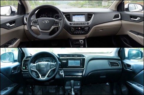Trang bị nội thất bên trong của cả hai cũng khá cân bằng. Honda City tuân thủ thiết kế bên ngoài với nội thất đen, các ghế ngồi ôm lưng hơn, và các điểm nhấn bên trong mang nhiều nét thể thao, cứng cáp. Trong khi đó, Hyundai Accent được trang bị các tính năng tiện dụng cao như ngăn chứ đồ làm mát, bệ tựa tay có thể trượt điều chỉnh vị trí…