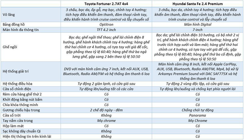 Không gian bên trong của Toyota Fortuner 2.7AT 4x4 và Hyundai Santa Fe 2.4 Premium cũng thiết lập theo hai phong cách trái ngược. Đại diện Toyota vẫn trung thành với phong cách thực dụng, trang bị vừa đủ dùng và các họa tiết trang trí sang trọng. Trong khi đại diện của Hyundai phát triển theo hướng hiện đại và tinh tế theo các dòng xe đến từ Châu Âu.