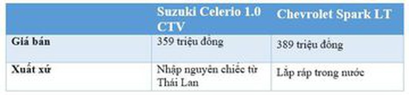 Spark có giá bán lẻ đề xuất đắt hơn Celerio 30 triệu nhưng hiện tại đang được áp khuyến mãi giảm 25 triệu, đẩy mức chênh lệch với Celerio chỉ còn 5 triệu. Trong khi đó, Celerio được nhập nguyên chiếc từ Thái với độ bền được đánh giá cao hơn và có giá rẻ hơn. Vì vậy ở thời điểm hiện tại, so về mức giá thì sự chênh lệch là có nhưng không đáng kể. Điều quan trọng tiếp theo chính là xem xét về mức tiêu hao nhiên liệu và các trang bị tính năng, an toàn.