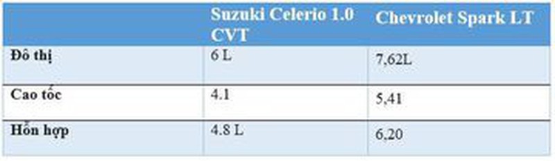 Nhờ động cơ dung tích thấp, kết hợp cùng trọng lượng bản thân chỉ khoảng 800 kg nên Suzuki Celerio có khả năng tiết kiệm nhiên liệu vượt trội hơn so với Chevrolet Spark. Đây là yếu tố rất đáng cân nhắc vì với một chiếc xe tiết kiệm nhiên liệu thì giá trị kinh tế mang lại về lâu dài là rất lớn. Đặc biệt, nếu bạn mua xe với mục đích kinh doanh dịch vụ, hoặc đặt tiêu chí tiết kiệm nhiên liệu lên hàng đầu thì Suzuki Celerio chính là sự lựa chọn phù hợp hơn cả.