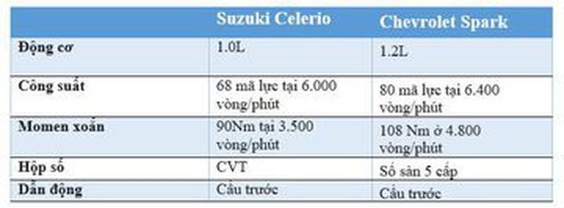 Từ những so sánh nhỏ trên có thể rút ra rằng, Suzuki Celerio 1.0 CVT thích hợp với những người mua xe với tiêu chí về một chiếc xe đơn giản, giá rẻ, nội thất rộng, động cơ bên bỉ, tiện nghi đủ dùng và cảm giác lái mượt mà, còn Chevrolet Spark lại thích hợp với những cá nhân yêu công nghệ, thích sự trẻ trung, năng động và cần một chiếc xe cỡ nhỏ với khả năng vận hành mạnh mẽ hơn.
