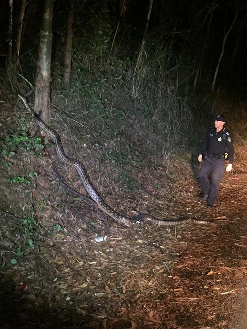 Hai sĩ quan bắt gặp con trăn thuộc loài Scrub Python ở giữa đường khi họ đi tuần trong một khu vực rậm rạp tối 10/12 ở Wujul Wujul, phía bắc thành phố Cairns.