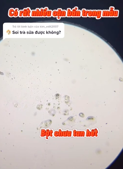 Khi soi trà sữa ở mức phóng đại gấp 40 lần, tài khoản Tik tok này cho biết trong loại nước này có lẫn nhiều cặn bẩn, bột chưa tan hết.