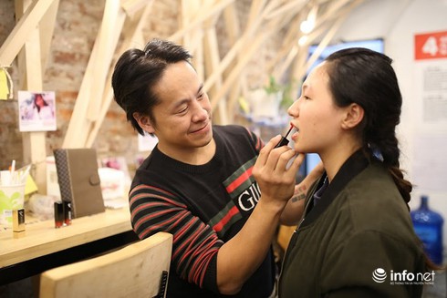 Anh Đào Khánh Hiệp tự tay tô son cho các bạn trẻ muốn thử trải nghiệm "hương vị" của son socola tại cửa hàng. |