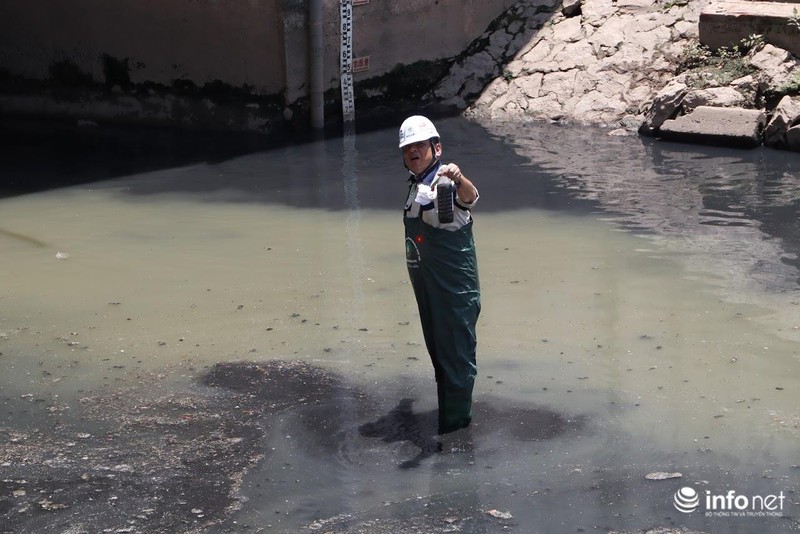 TS. Kubo Jun trực tiếp lội xuống lòng sông Tô Lịch để kiểm tra thiết bị sau 20 ngày kể từ khi đặt máy làm sạch nước. |