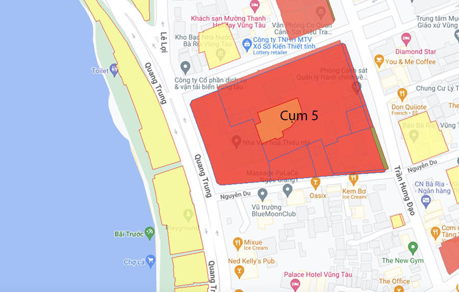 Ngoài diện tích đất 27.643m2, khu Cụm 5 còn có tài sản công. Đây được xem là “tứ giác vàng” của TP.Vũng Tàu khi 4 mặt tiếp giáp với 4 tuyến đường Thống Nhất – Nguyễn Du – Trần Hưng Đạo – Quang Trung. Năm 2019, đơn vị tư vấn đã định giá đất và tài sản tại khu Cụm 5 có giá trị 2.213 tỷ đồng.