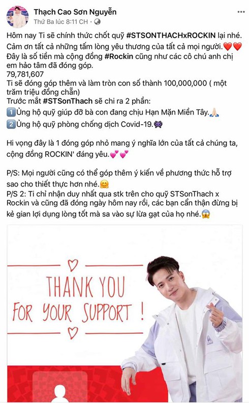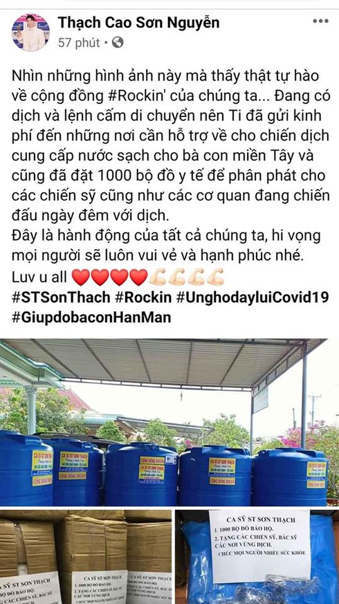 "Nhìn những hình ảnh này mà thấy thật tự hào về cộng đồng #Rockin' của chúng ta... Đang có dịch và lệnh cấm di chuyển nên ST đã gửi kinh phí đến những nơi cần hỗ trợ về cho chiến dịch cung cấp nước sạch cho bà con miền Tây và cũng đã đặt 1000 bộ đồ y tế để phân phát cho các chiến sỹ cũng như các cơ quan đang chiến đấu ngày đêm với dịch. Đây là hành động của tất cả chúng ta, hi vọng mọi người sẽ luôn vui vẻ và hạnh phúc nhé" - S.T Sơn Thạch bày tỏ.