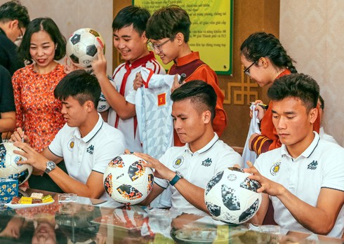 Duy Mạnh, Quang Hải, Bùi Tiến Dũng ký tặng các fan tại trường THCS Nam Trung Yên. |