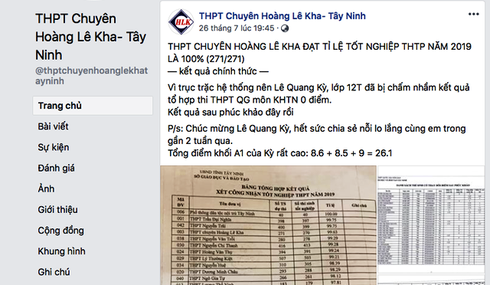 Lãnh đạo Trường THPT chuyên Hoàng Lê Kha cho biết, vì trục trặc hệ thống nên Lê Quang Kỳ bị chấm nhầm kết quả tổ hợp thi THPT quốc gia môn Khoa học Tự nhiên. Sau khi có kết quả phúc khảo, tỷ lệ tốt nghiệp năm 2019 của trường là 100%.