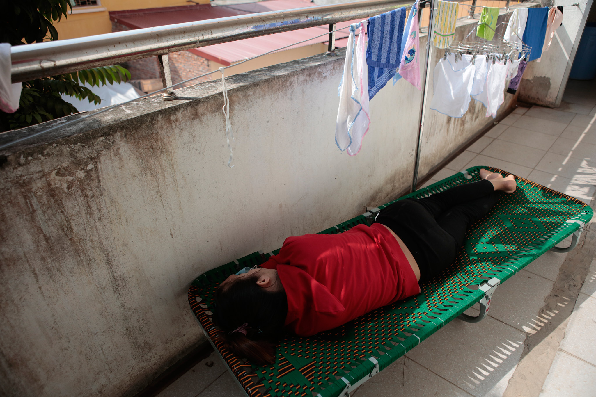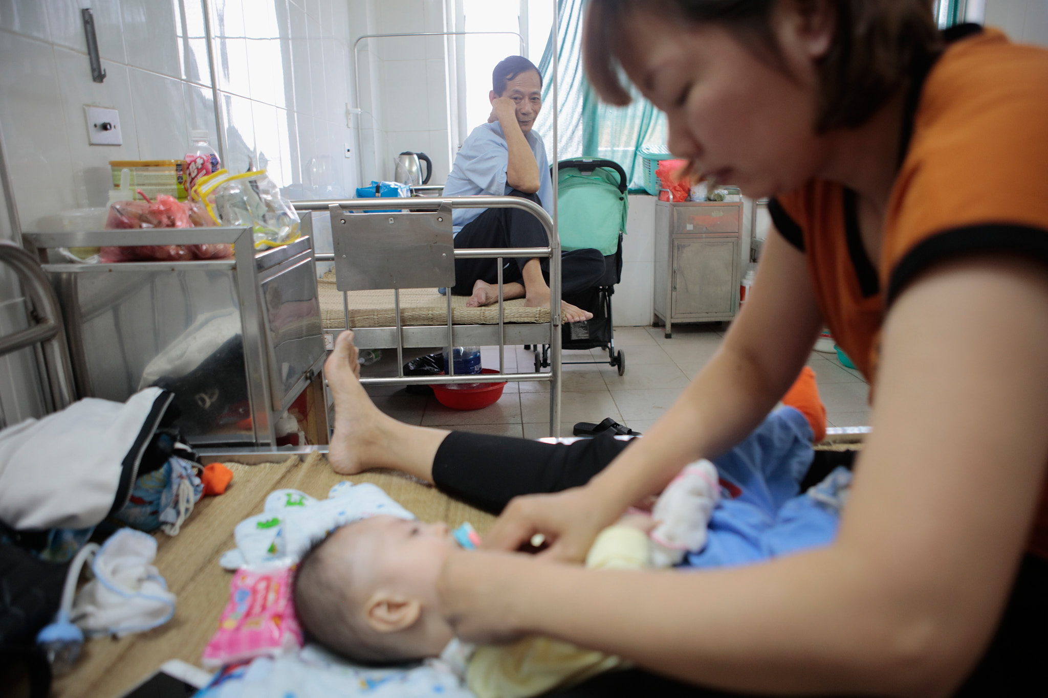 Vừa thơm nhẹ lên cặp má trắng nõn của em bé đang ngủ, chị Dung vừa “mách tội”: “Chỉ khi ngủ thì cô ta mới đáng yêu thế này thôi, chứ bình thường thì hét to, nghịch lắm, khua khoắng tay chân làm vỡ hết ven, phải lấy ven đầu để tiêm kháng sinh đấy. Cô chị hiền hơn một tí thì giao cho bà nội “quản lý”. Trưa bà ngủ ở ghế xếp với chị, đến tối đổi ca, mẹ với em lại xuống ghế ngủ cho bà nằm giường”.