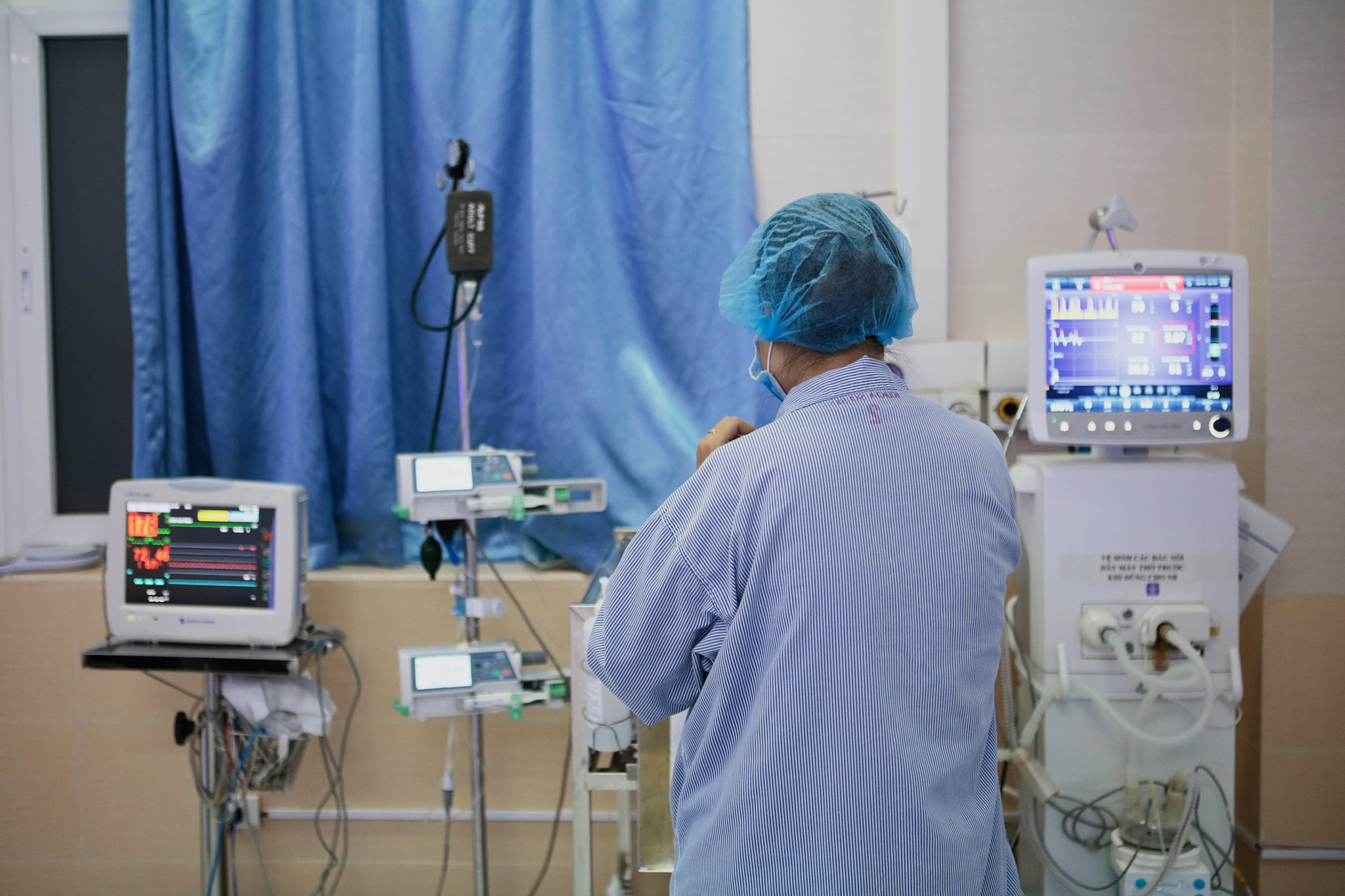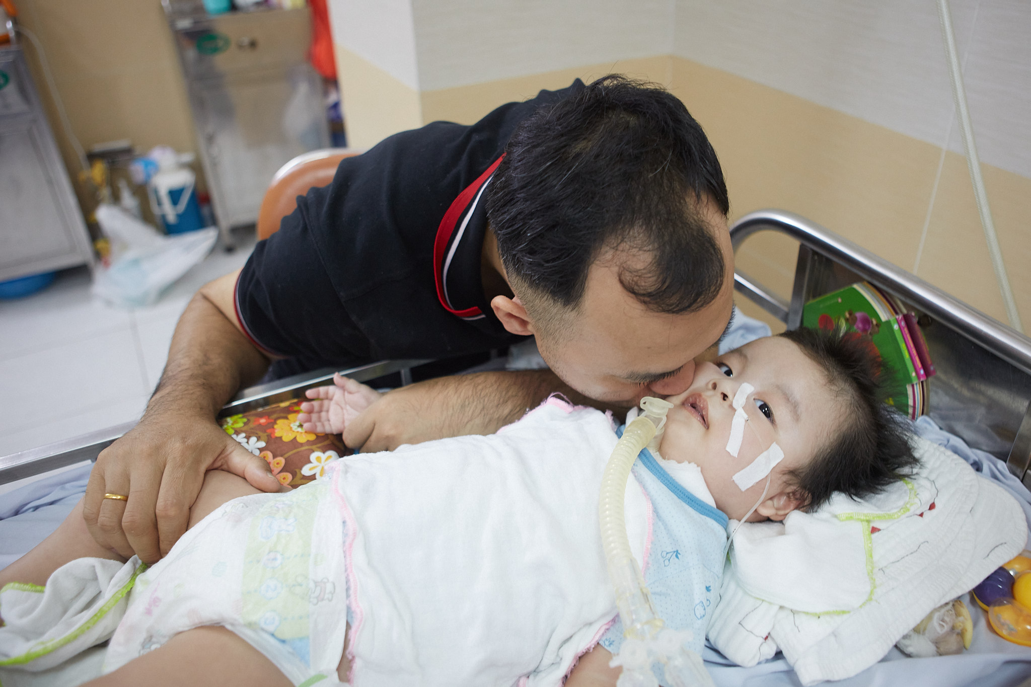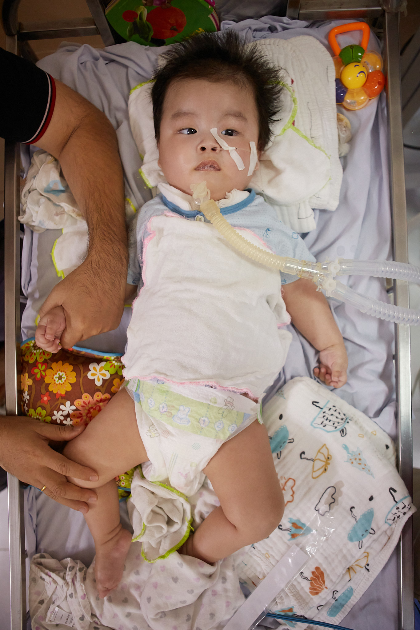Ở gần đó, bố của bé Đức Trung (10 tháng tuổi), đang rút đờm dãi, massage tay chân cho con. Cậu bé trắng nõn nà, tay chân bụ bẫm phải thở máy từ mấy tháng nay liếc mắt qua nhìn bố, thỉnh thoảng cười toe như nghĩ ra chuyện gì thú vị lắm. Bố em cho biết, em bị teo cơ tủy sống từ sơ sinh - một bệnh về gen rất hiếm.