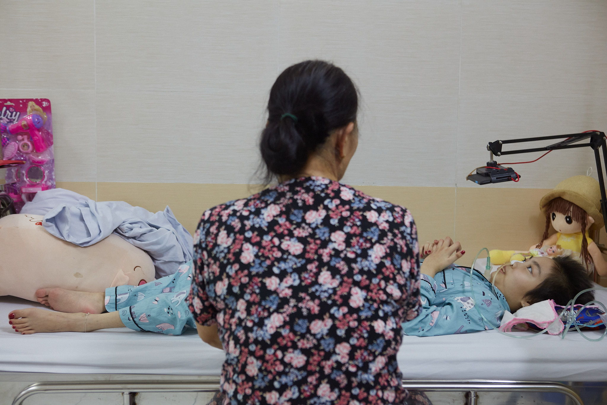 “Bố mẹ nó chỉ đến buổi tối, chơi với con một tí rồi về, còn cả ngày cả đêm tôi túc trực ở đây. Bố mẹ nó cũng xót con lắm, nhất là mẹ nó, cứ thấy con là khóc lả đi. Nhưng mà còn phải đi kiếm tiền thuốc men, rồi còn hai đứa em của nó nữa, sao mà ở viện suốt được. Thương con thì cũng thương luôn cả cháu, nên tôi cố, chứ tôi mà buông thì con bé biết dựa vào ai”, bà kể, giọng nhỏ nhẻ như sợ con bé nghe thấy thì tủi thân.