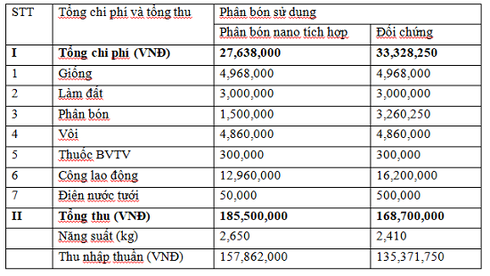 Kết quả phân tích về tổng chi phí và tổng thu cho thấy khi sử dụng phân bón nano sẽ làm giảm tổng chi phí 27.638.000 đồng khi sử dụng phân bón nano tích hợp, so với 33.328.250 đồng. Năng suất thu được ở nhóm thí nghiệm là 2.650 kg/ha, cao hơn so với nhóm đối chứng 2410 kg/ha.