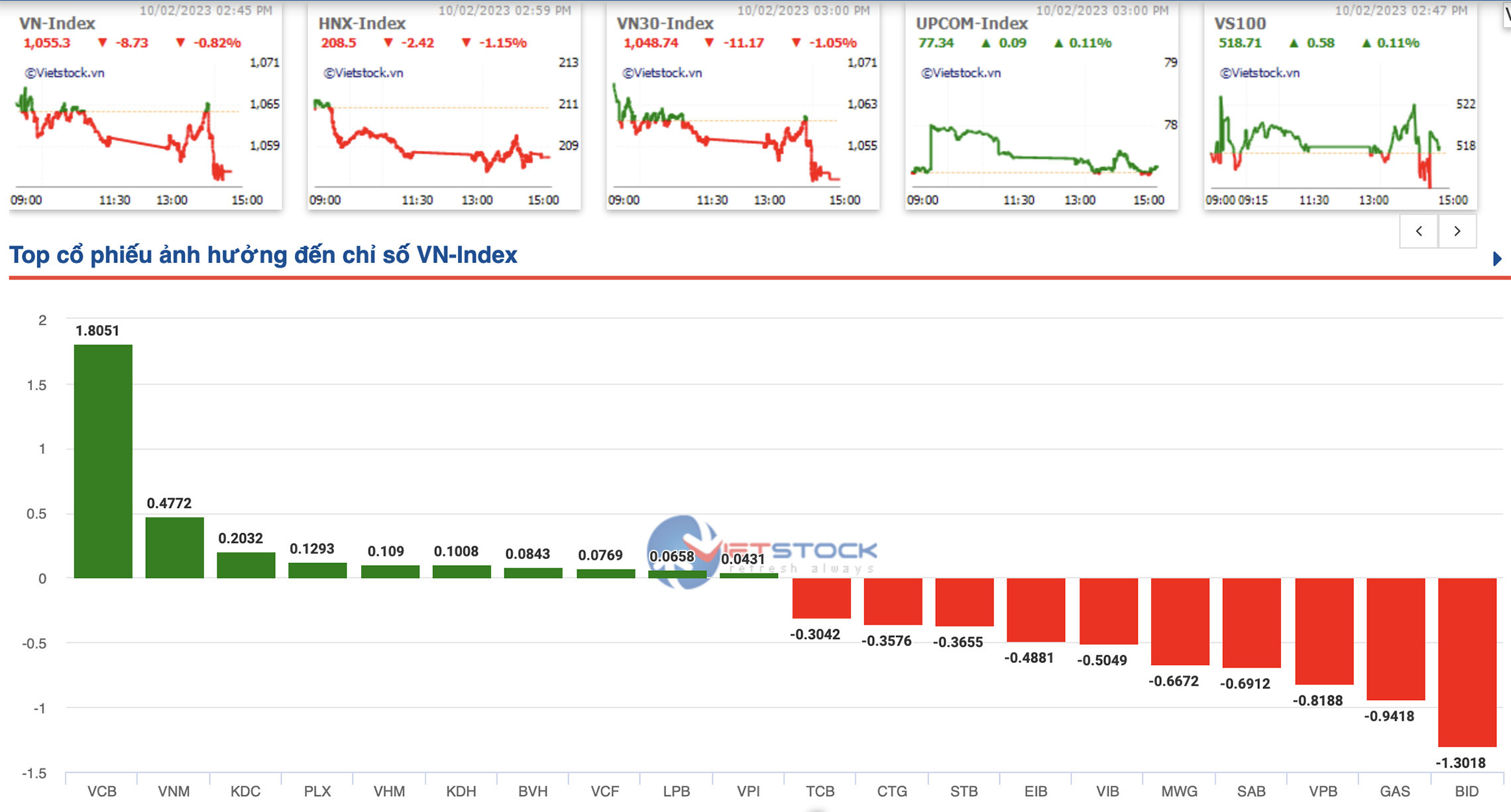 Chốt phiên 10/2, VN-Index giảm về mức 1.055,3 điểm. HNX-Index giảm 3,15%, chốt phiên ở mức 208,5 điểm. Upcom-Index tăng 2,4% lên mức 77,3 điểm.