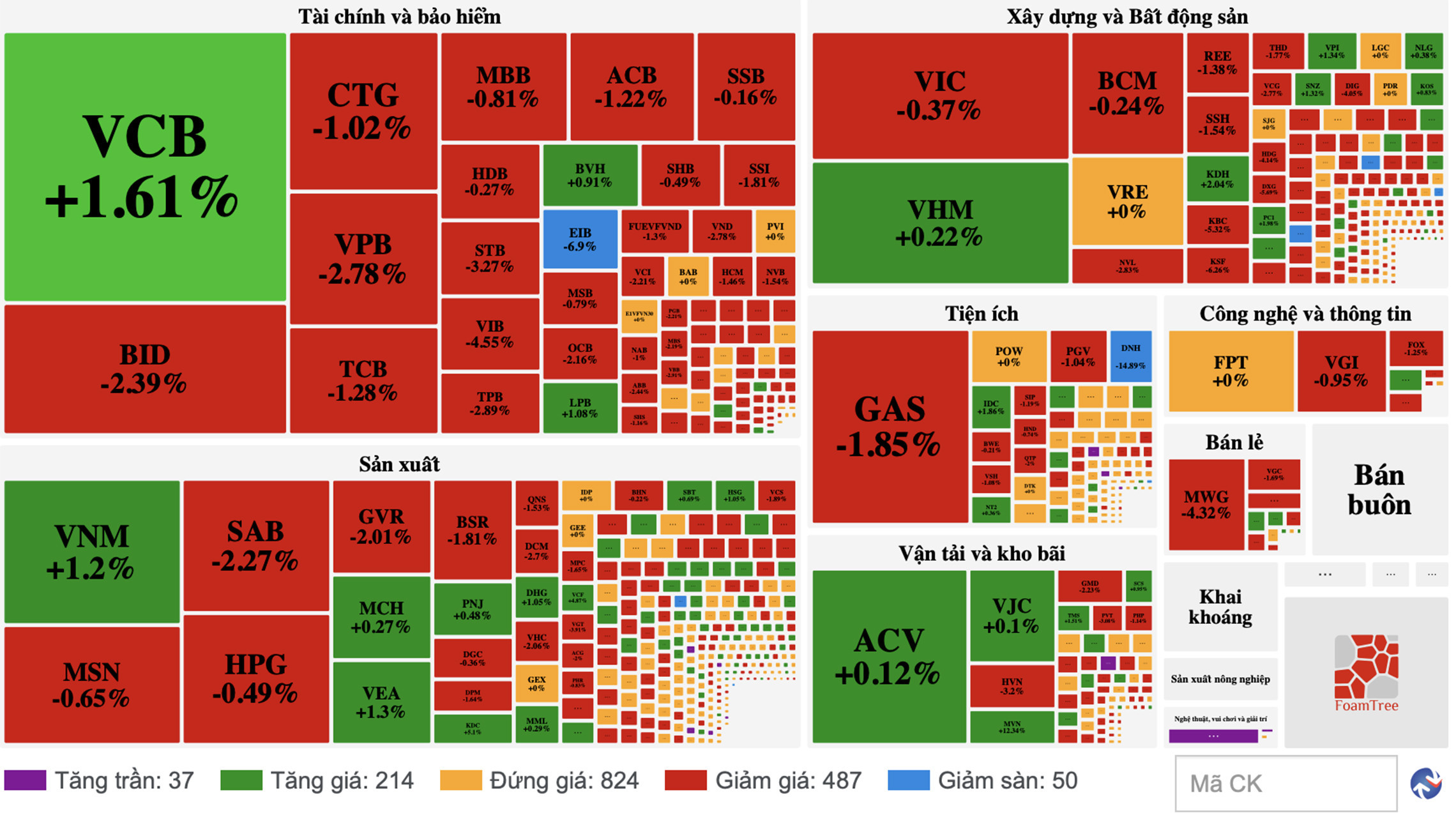 Ngành ngân hàng phân hóa mạnh mẽ khi VCB là cổ phiếu giữ nhịp chỉ số, còn VPB, MBB, VIB lại là những cổ phiếu gây giảm điểm mạnh. Bất động sản có một tuần giảm điểm mạnh như VHM (-5,6%), NVL (-8,0%), DXG (-13,4%).