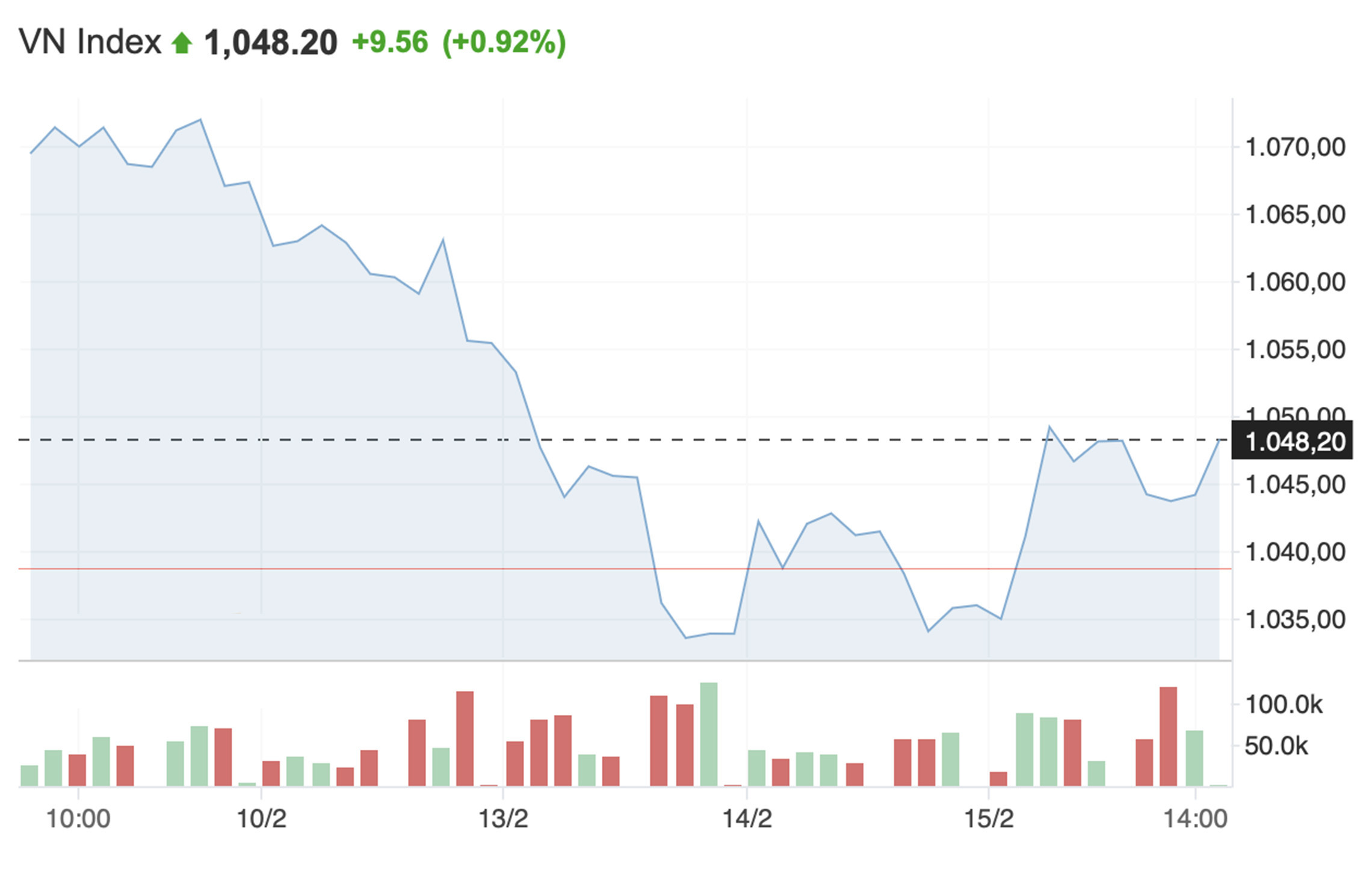 Kết phiên 15/2, VN-Index tăng 9,5 điểm (0,92%) lên mốc 1.048 điểm.