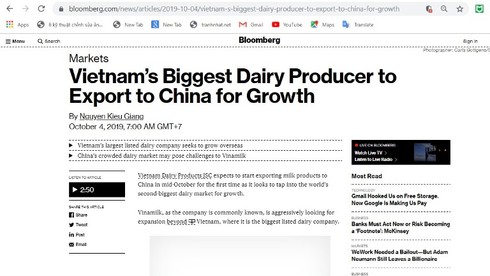 Bloomberg đã đưa tin tức với tiêu đề “Công ty sữa lớn nhất Việt Nam hướng tới việc xuất khẩu sang Trung Quốc để tăng trưởng”. |