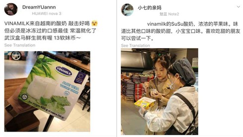 Một tài khoản trên mạng xã hội Weibo đã bình luận rằng: “Tôi biết về Vinamilk, họ rất đáng tin cậy”. Đây tuy là những bình luận rất ngắn gọn nhưng mang nhiều hàm ý tốt đẹp dành cho thương hiệu sữa Việt Nam khi bắt đầu tiếp cận với người tiêu dùng Trung Quốc. Trên các mạng xã hội cũng ghi nhận được những bình luận, đăng tải từ người tiêu dùng Trung Quốc về sản phẩm Vinamilk như: “Sữa chua Vinamilk Việt Nam, siêu ngon, nhưng mà nhớ ăn lúc còn lạnh nhé, để tan ra thì ăn không đúng vị nữa rồi, mình mua ở Hema Vũ Hán, giá 13 tệ”.