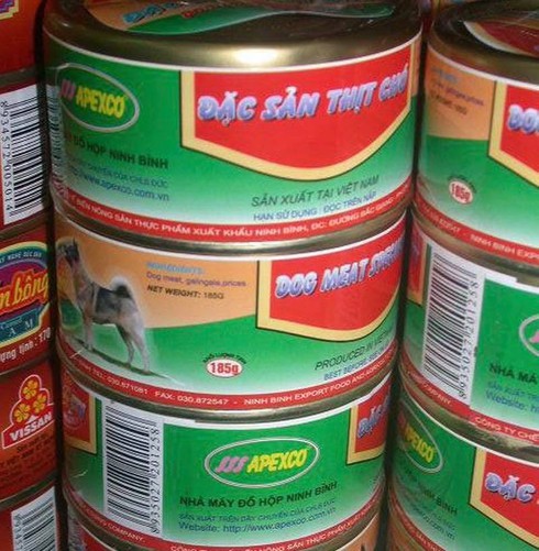Hình ảnh những chiếc hộp với mẫu mã bắt mắt kèm dòng chữ "Đặc sản thịt chó" được sản xuất tại Ninh Bình. Trên bao bì có ghi rõ loại thịt chó đóng hộp này được sản xuất tại Nhà Máy Đồ Hộp Ninh Bình (APEXCO) theo công nghệ của Đức. Trên bao bì vỏ hộp còn có ghi địa chỉ trang website của công ty là apexco.com.vn. Những hộp thịt chó này còn được cho là xuất khẩu ra nước ngoài.