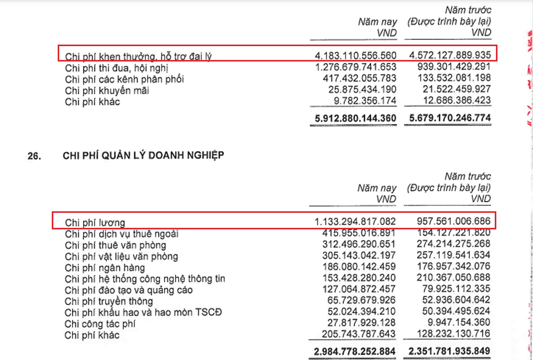 Theo báo cáo tài chính của Manulife Việt Nam, năm 2022 công ty chi hơn 4.183 tỷ đồng cho chi phí khen thưởng và hỗ trợ đại lý, giảm 8,5% so với mức chi năm 2021. Trong khi đó, chi phí hoa hồng là 3.191 tỷ đồng, giảm 5% so với năm 2021.