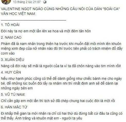 Chẳng hạn, bài viết liệt kê câu thơ được coi là của "ông trùm" thơ tình Xuân Diệu: "Nàng cả đời này sẽ mãi là người của ta, vì ta đã chôn nàng vào tim mình rồi". Của Huy Cận: "Nếu như hạnh phúc cũng có thể để dành giống như chiếc bánh mẹ cho ngày bé, để những lúc buồn đói lấy ra nhâm nhi, thì nhất định, anh sẽ để dành lại những ngày bên em".
