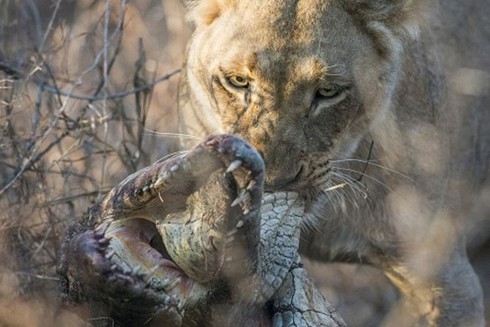 Nhiếp ảnh gia Mike Sutherland ghi lại pha săn mồi chớp nhoáng của con sư tử cái trong khu bảo tồn Sabi ở phía tây công viên quốc gia Kruger, Nam Phi, sau khi lần theo vết chân nó, Long Room hôm 17/1 đưa tin. Hàm răng của sư tử cái cắm xuyên qua lớp da dày ở họng cá sấu, khiến con bò sát dài 1,5 mét mau chóng tắt thở.