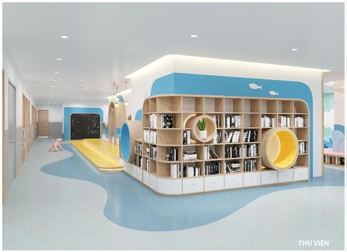 Phòng thư viện được thiết kế đẹp mắt, màu sắc sinh động, tươi sáng, kích thích niềm đam mê đọc sách cho trẻ. |