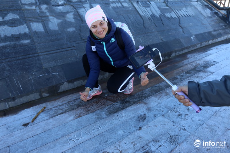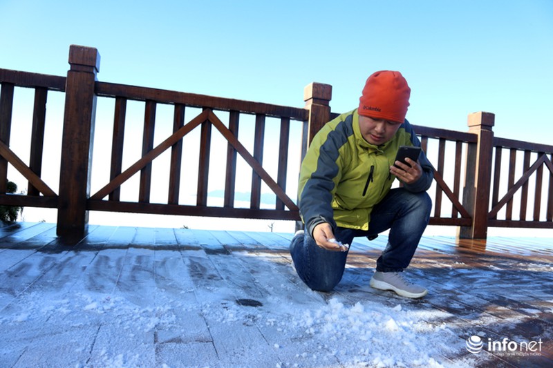 Các du khách thích thú trước hiện tượng hiếm gặp này. Lớp sương không quá dày nhưng bao phủ hầu khắp các bề mặt, tạo lớp màu trắng giống như tuyết. |