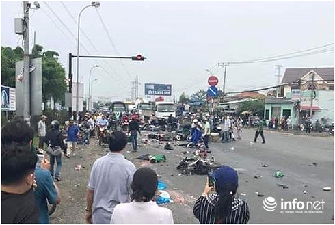 | Vụ tai nạn kinh hoàng xảy ra vào khoảng 15h30 chiều 2/1/2019, có khoảng 20 xe gắn máy đang đừng chờ đèn đỏ tại ngã tư Bình Nhật (gần cầu Bến Lức, tỉnh Long An) thì bất ngờ bị xe đầu kéo chở theo container lao tới từ phía sau. Do tài xế xe đầu kéo không làm chủ được tốc độ đã gây tai nạn liên hoàn. Cú va chạm đã khiến cho hàng loạt xe gắn máy bị cuốn vào gầm xe, một số khác văng xa hàng chục mét. Tại hiện trường, các nạn nhân nằm la liệt, người đi đường và dân địa phương đã hô hoán, chạy đến giúp đỡ. |