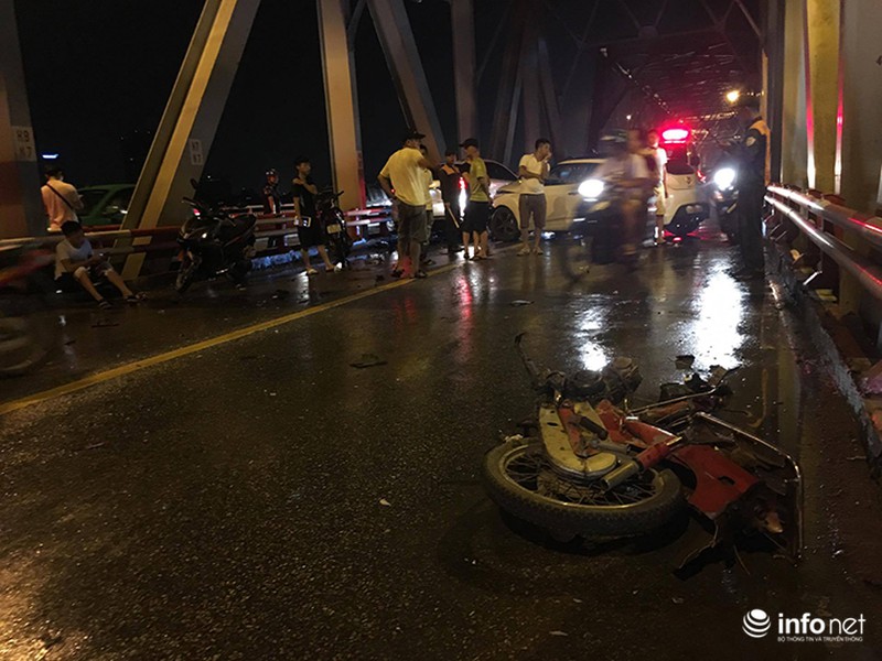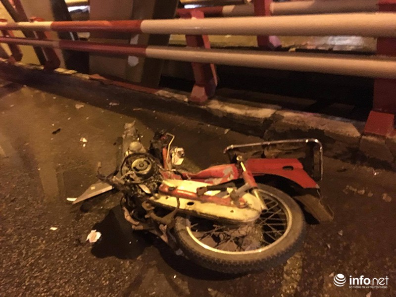 Tại hiện trường, chiếc xe máy của 3 nam thanh niên bị đứt đôi sau cú va chạm mạnh, hai chiếc xe ô tô bị hư hỏng ở nhiều chỗ. Các mảnh vỡ văng tứ tung khắp mặt cầu.