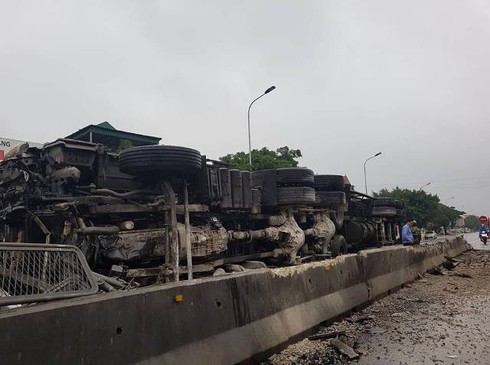 Tại hiện trường, khoảng 20m dải phân cách bị cày nát, lật nghiêng; chiếc xe đầu kéo cũng lật nghiêng giữa đường và bị hư hỏng nặng; nhiều hàng hóa văng ra đường.