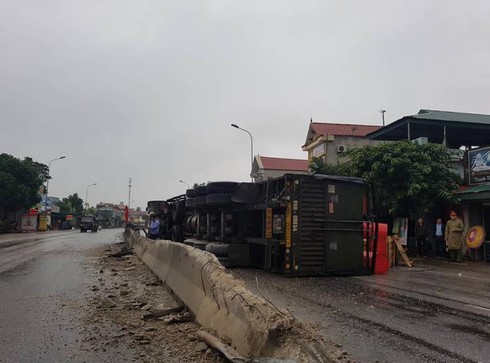 Khoảng 6h30’ ngày 9/1, tại Km 345+300 trên QL 1A, đoạn chạy qua địa bàn xã Quảng Chính (huyện Quảng Xương, Thanh Hóa), xe đầu kéo mang BKS 89C-110.76 kéo theo rơ moóc BKS 89R-008.54 do tài xế Nguyễn Quang Trọng (SN 1990, trú huyện Yên Sơn, tỉnh Tuyên Quang) điều khiển theo hướng Bắc – Nam bất ngờ tông vào dải phân cách, lật nghiêng giữa đường.