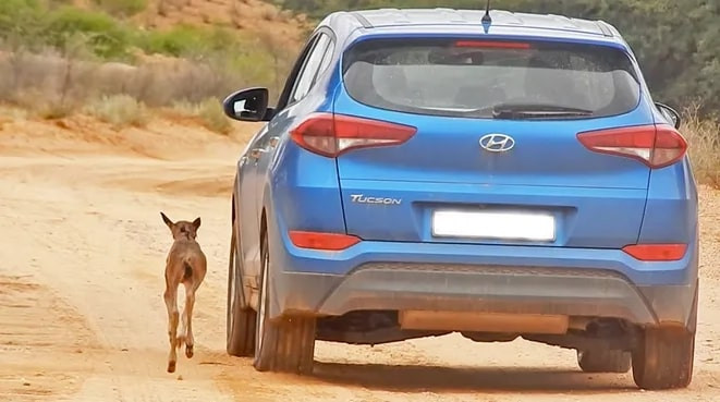Cảnh tượng hiếm thấy xảy ra bên trong khu bảo tồn thiên nhiên Kgalagadi Transfrontier, Nam Phi. Một con linh dương nhỏ bị lạc đàn đi lang thang trong khu bảo tồn. Khi nhận thấy bản thân bị lạc, con linh dương đuổi theo một chiếc xe ô tô vì cho rằng đó là mẹ của nó.