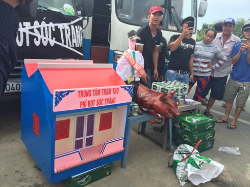 Khoảng 9h sáng nay 11/1, một nhóm tài xế đã mang một chiếc xe tải và 1 chiếc xe khách căng băng rôn "Phản đối BOT Sóc Trăng", đồng thời chở theo heo quay, gà, vịt và nhang, lập đàn, khấn vái cách trạm thu phí chưa đầy 100m.