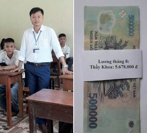 "Sau gần 20 năm ra trường, đây là lần đầu tiên mình công khai chia sẻ thông tin thu nhập của một viên chức ngành giáo dục. Không phải chê ít hay kêu ca phàn nàn gì mà do gặp được dãy số rất đẹp. Sau khi trừ đi các khoản như: Đảng phí, Công đoàn phí, quỹ tham quan, quỹ vì người nghèo, quỹ thăm hỏi và một số loại quỹ khác nữa thì còn lại con số 5.678.000 VND” – Thầy Khoa viết trên dòng trạng thái Facebook.