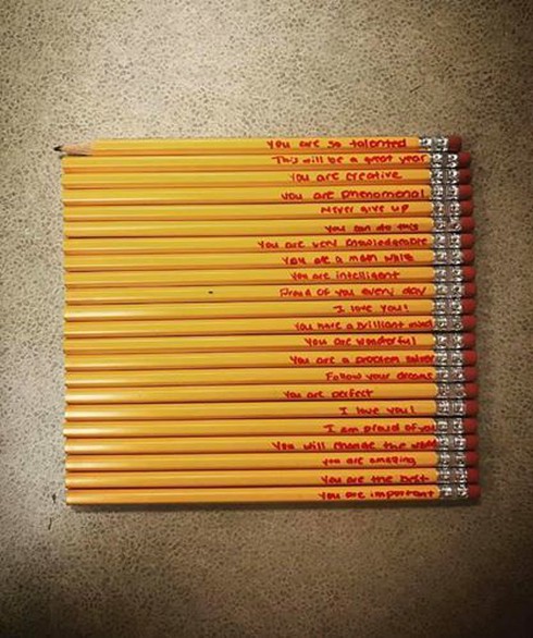 Thấy vậy, một cậu bé đã đưa cho cô giáo những cây bút của mình. Điều bất ngờ, khi nhận được cây bút từ học trò, cô Amanda Cox phát hiện thấy ở phần đuôi của mỗi cây bút đều có viết những lời khích lệ, động viên. “Lúc ấy tôi mới biết là mẹ của học trò đã dành thời gian để viết ra những lời này”, cô Amanda nói.