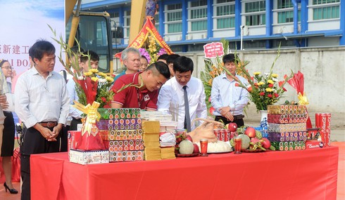 Ông Nguyễn Xuân Đông (thứ hai từ phải sang) tại lễ động thổ xây dựng Nhà máy sản xuất giày Nike giai đoạn 2 tại xã Nghĩa Minh, huyện Nghĩa Hưng, tỉnh Nam Định, tháng 9/2018. Ảnh: An Quý Hưng. |