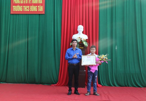 Đại diện Tỉnh Đoàn Thanh Hóa trao tặng bằng khen cho em Nguyễn Bình Minh, người đã trả lại tài sản cho người đánh rơi. |