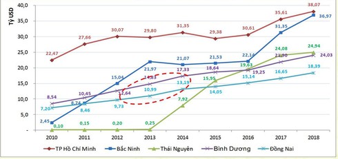 Một “ngôi sao” mới nổi khác được đề cập là Thái Nguyên. Trong 8 năm tỉnh này đã tăng giá trị xuất khẩu từ 0,10 tỷ USD lên đến 24,94 tỷ USD. Tính đến năm 2018, Thái Nguyên cũng đã vượt qua Bình Dương (24,03 tỷ USD) và Đồng Nai (18,39 tỷ USD) để giữ vị trí thứ 3 trong danh sách 5 tỉnh xuất khẩu nhiều nhất nước, chỉ sau TP.HCM và Bắc Ninh.