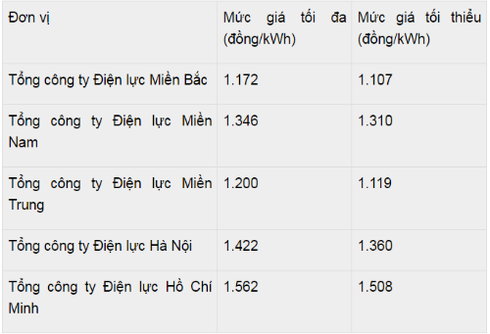 | Đơn vị | Mức giá tối đa (đồng/kWh) | Mức giá tối thiểu (đ/kWh) |