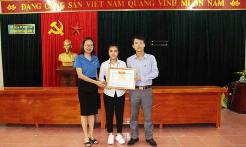 Sáng 18/10, Huyện đoàn Anh Sơn (Nghệ An) đã trao tặng giấy khen và phần thưởng động viên em Lê Thị Hoa (học sinh lớp 12D5, trường THPT Anh Sơn 1) vì đã có hành động đẹp, nhặt được của rơi trả người đánh mất.