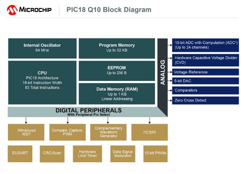 Một trong số các CIP tích hợp bên trong dòng vi điều khiển PIC18 Q10 là thiết bị phát sóng bổ sung (Complementary Waveform Generator - CWG), giúp đơn giản hóa các thiết kế chuyển mạch phức tạp, và một Bộ chuyển đổi Analog-to-Digital tích hợp thực hiện các tính toán nâng cao và lọc dữ liệu trong phần cứng mà không cần bất kỳ sự can thiệp nào từ phần lõi của bộ vi điều khiển.