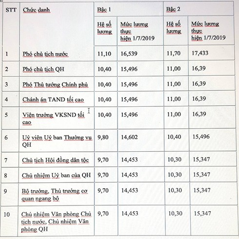 Còn với bộ trưởng và thủ trưởng cơ quan ngang bộ lương bậc 2 thì có hệ số 10,30 nhân với lương cơ sở ra mức lương 15,347 triệu đồng.