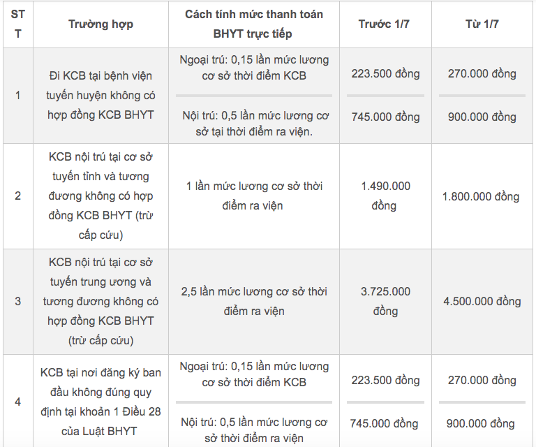 Ngoài ra, người có thời gian tham gia BHYT 5 năm liên tục trở lên và có số tiền cùng chi trả chi phí khám chữa bệnh trong năm lớn hơn 6 tháng lương cơ sở (tương đương 10,8 triệu đồng), trừ trường hợp tự đi khám chữa bệnh không đúng tuyến, cũng được BHYT chi trả 100%. Mức tiền đồng chi trả để được BHYT thanh toán 100% hiện nay là 8,94 triệu, từ 1/7 tăng lên 10,8 triệu đồng.